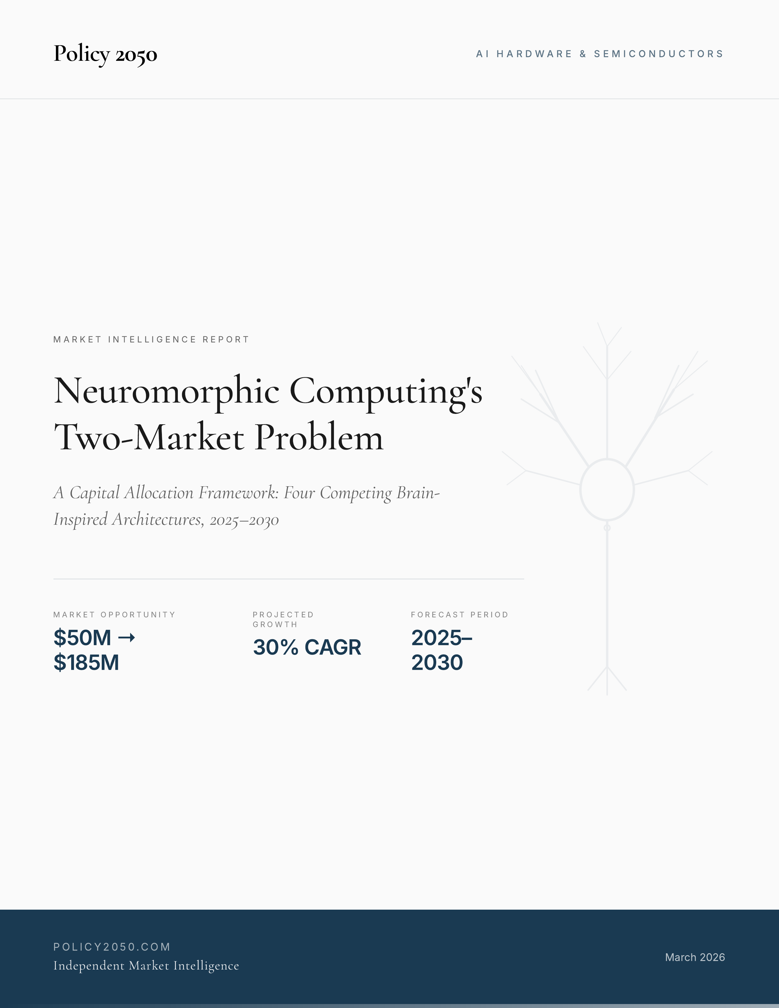Companies profiled include BrainChip, Intel (Loihi), Unconventional AI, Great Sky, Innatera, Q.ANT, SpiNNcloud, Prophesee, and Lightmatter. The report delivers 10 charts, a four-architecture comparison framework, scenario-based forecasts, and a methodology appendix reconciling published market size estimates. Written for AI infrastructure strategists, semiconductor investors, and technology executives evaluating compute roadmap allocation decisions.