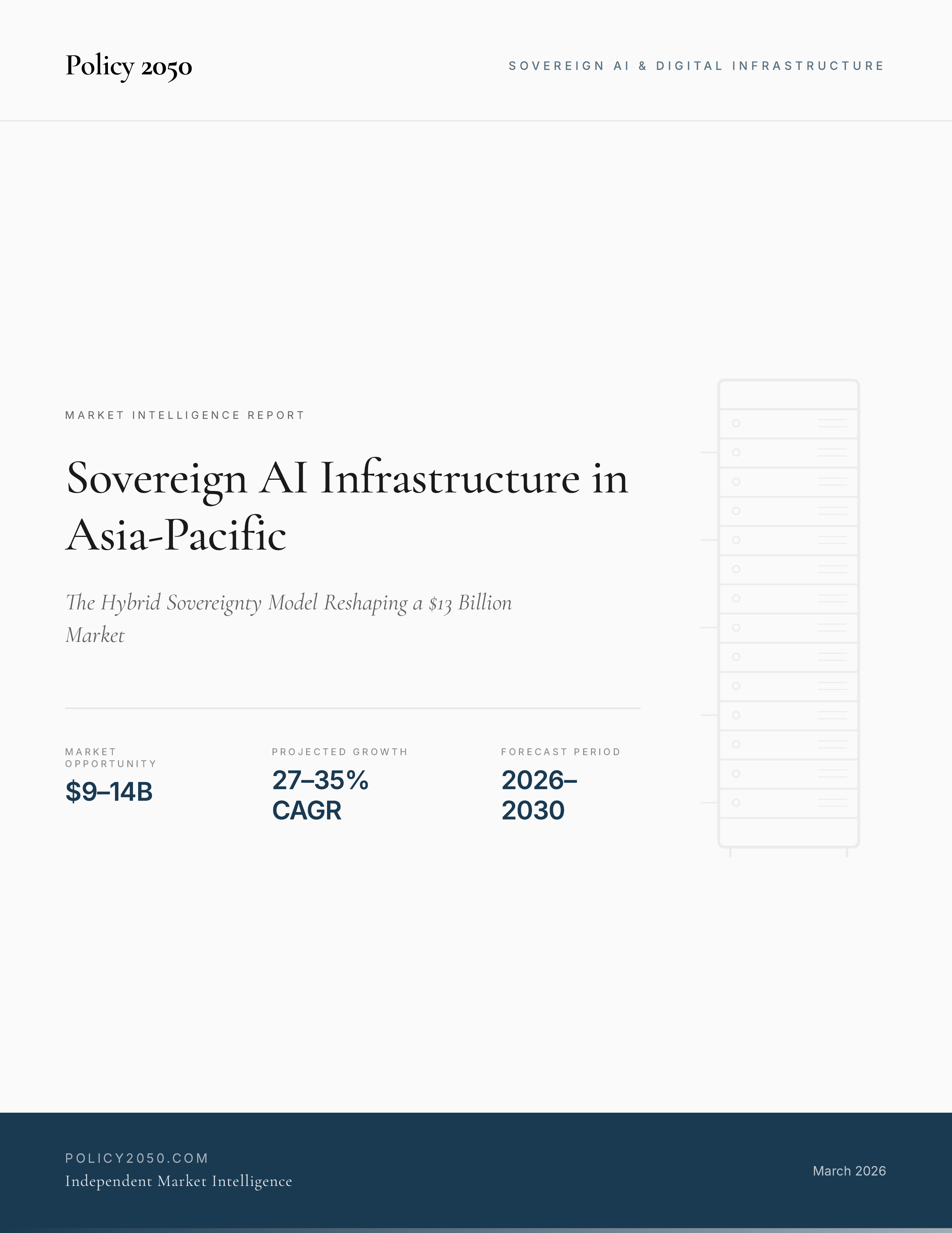The Asia-Pacific sovereign AI infrastructure market is estimated at $9–14 billion in 2026 and is projected to reach $23–47 billion by 2030, representing a 27–35% compound annual growth rate. This report provides a dedicated analysis of the infrastructure that APAC nations are building to ensure domestic control over AI capabilities — encompassing government-funded GPU compute programs, sovereign-fund-backed data center campuses, telco-led sovereign cloud platforms, and domestically governed AI factories. It delivers original market sizing, country-level strategy mapping, and scenario-based forecasts across the region.